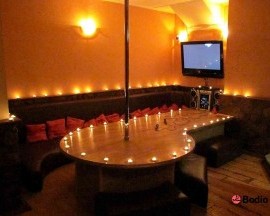 ● Гостиная большого зала оборудована огромным столом-подиумом со встроенным стрип-шестом и мягкими диванами вокруг.