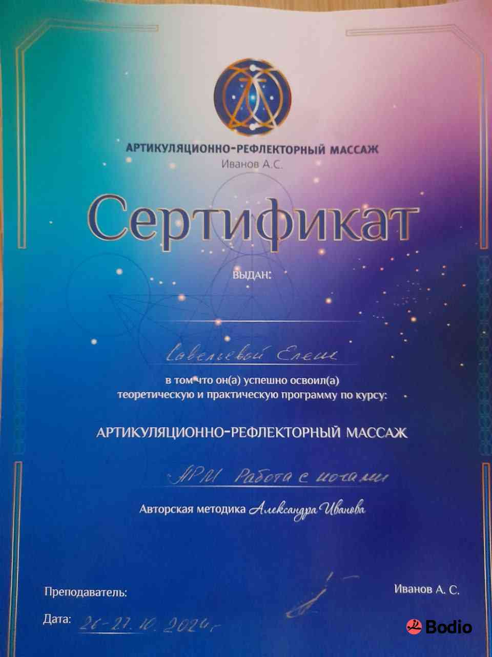 Владею различными техниками массажа и диафрагмальными практиками, мягкими практиками мышечно-суставной коррекции, восточными техниками психомануальной коррекции, техниками артикуляционнно-рефлекторного массажа.