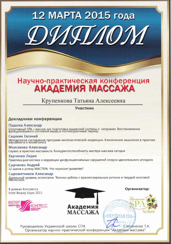 Здравствуйте, меня зовут Татьяна Алексеевна, массажист. Имею медицинское образование:медицинская сестра, свидетельство об окончании курсов классического массажа, сертификаты: целлюлитотерапия, ароматерапия в массажном деле, бразильская попка. Опыт работы 4 года. Владею массажами: классическим, лечебным, антицеллютным, медовым, баночным, спортивным (до тренировки и после), расслабляющим, тонизирующим, делаю массаж лица. Массаж лица скульптурный и противоотечный. Так же делаю обертывания и пилинги, которые помогут избавиться от лишних сантиметров, улучшить кровоток, оказать самое благоприятное воздействие на организм. О пользе массажа всем известно с древних времён, массажист-одна из древнейших профессий. Массаж может заменить любое лекарство, но ни одно лекарство не заменит массаж. Понимая, что в России этот вид помощи больше воспринимается как экзотика, ежели чем действенный комплекс лечебно-профилактического воздействия на организм человека, я решила изучить не только теоретически, но и практически, как можно подробнее ответ на вопрос: «Что же такое массаж?».Для каждого он несет индивидуальный смысл. К примеру, для девушек эта процедура ухода за телом – spa, антицеллюлитные программы и прочее. Целью таковых является, как правило, стремление притягивать взгляды противоположного пола ухоженным и стройным видом.